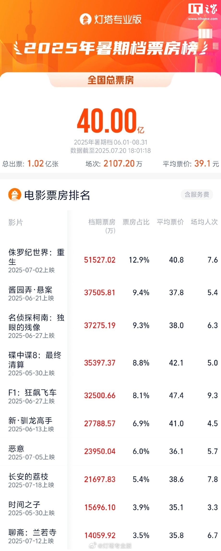 IT之家 7 月 20 日消息,据灯塔专业版,截至 7 月 20 日 18 时 01 分,2025 年暑期档(6 月-8 月)总票房(含预售)突破 40 亿。《侏罗纪世界:重生》《酱园弄・悬案》《名侦探柯南:独眼的残像》暂列档期票房前三名。