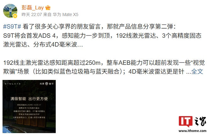 IT之家 7 月 20 日消息,华为智选车产品总监(享界系列)@彭磊_Lay 昨日发文分享了鸿蒙智行享界 S9T 新车的感知能力,并科普了 192 线激光雷达、高精度固态激光雷达、分布式 4D 毫米波雷达的能力和作用。