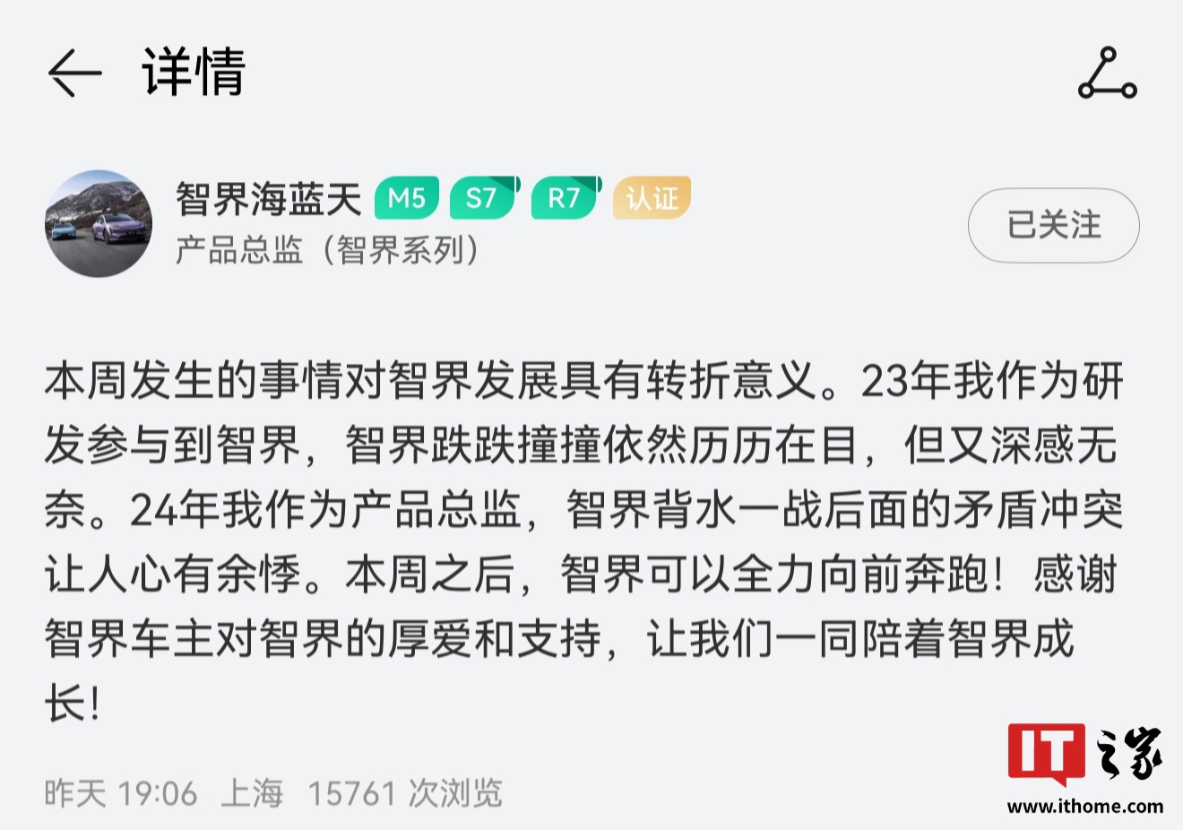 IT之家 7 月 20 日消息,智界系列产品总监 @智界海蓝天 本月曾发文:“对智界的喧嚣已尘埃落地,智界加油,未来可期!”同时他还表示“智界可以全力向前奔跑”。