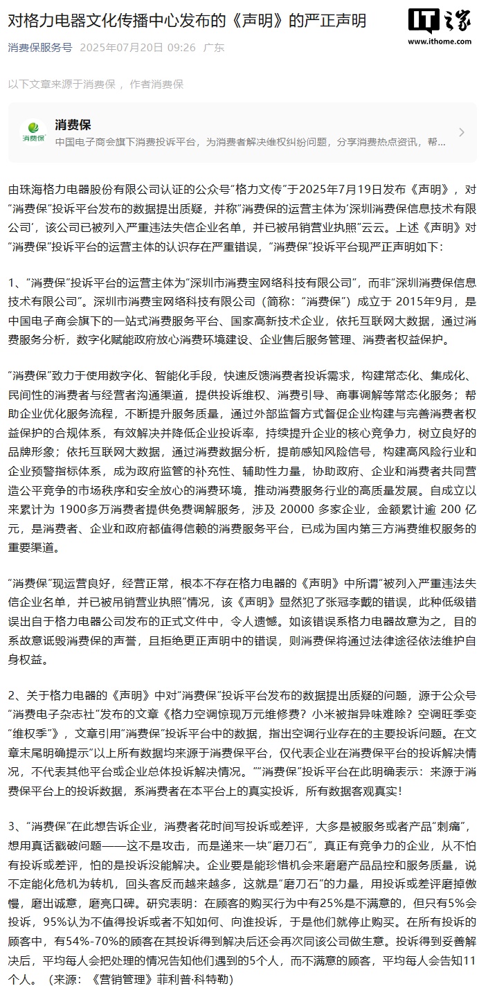 IT之家 7 月 20 日消息,格力官方微博 @格力文传 昨晚发文对“消费保”投诉平台发布的数据提出质疑,并称“消费保的运营主体为‘深圳消费保信息技术有限公司’,该公司已被列入严重违法失信企业名单,并已被吊销营业执照”。对此,“消费保”今日进行了回应。