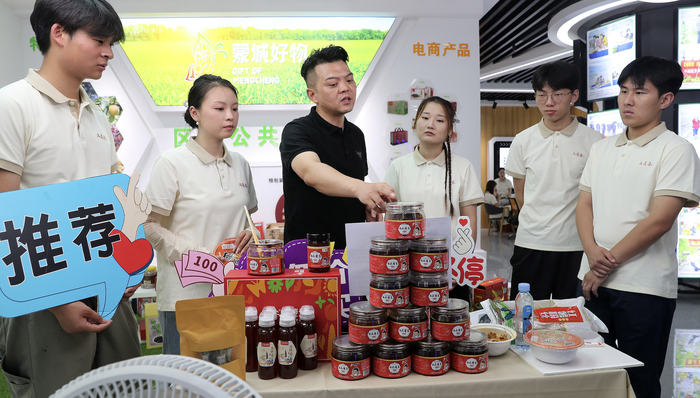 2025年7月3日,安徽亳州,大学生和电商主播在蒙城县电子商务公共服务中心交流电商直播技艺。图片来源:CFP