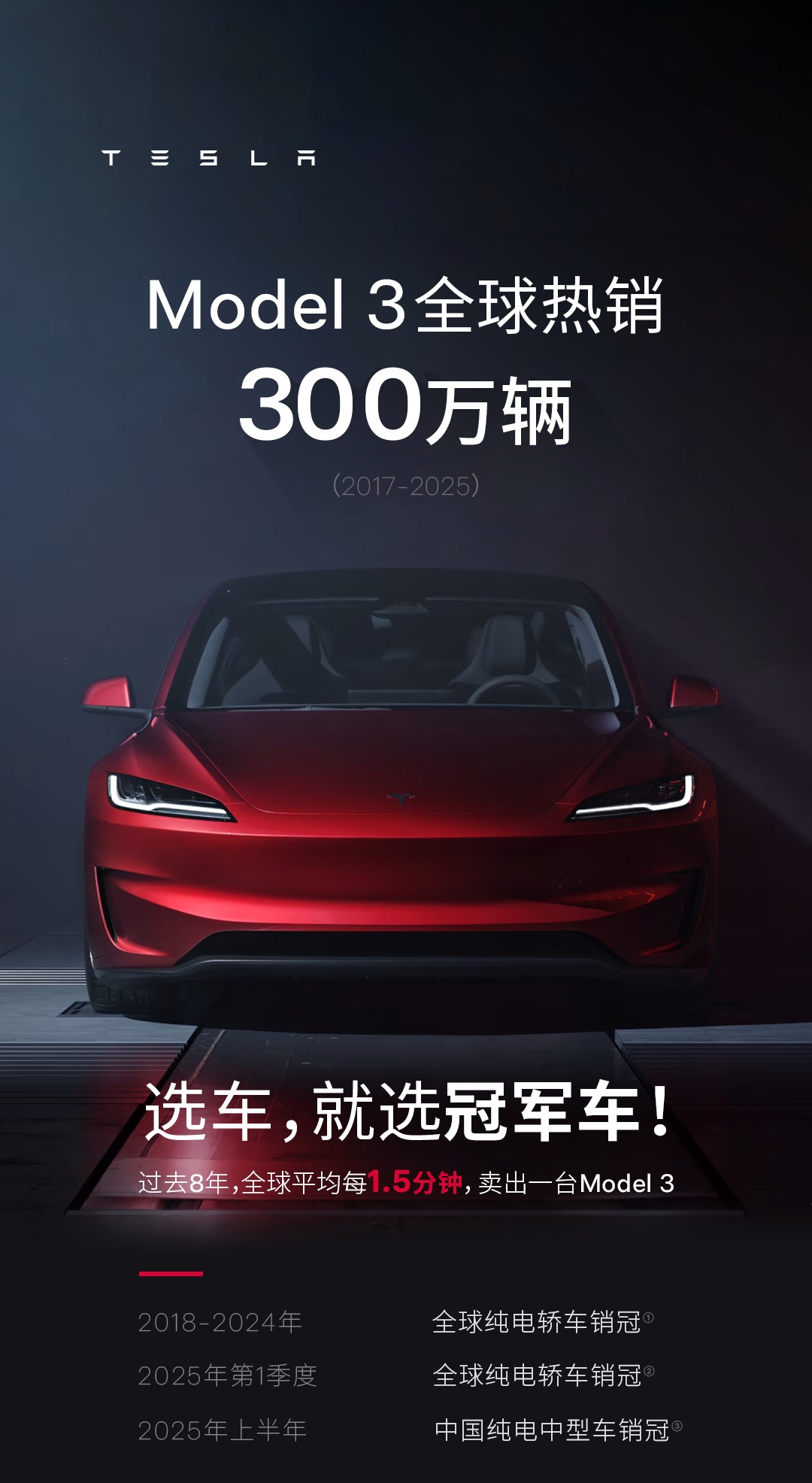 IT之家 7 月 21 日消息,特斯拉官方刚刚发文,宣布 Model 3 全球销售破 300 万辆,蝉联 7 年全球纯电轿车销冠,平均 1.5 分钟卖出一台。