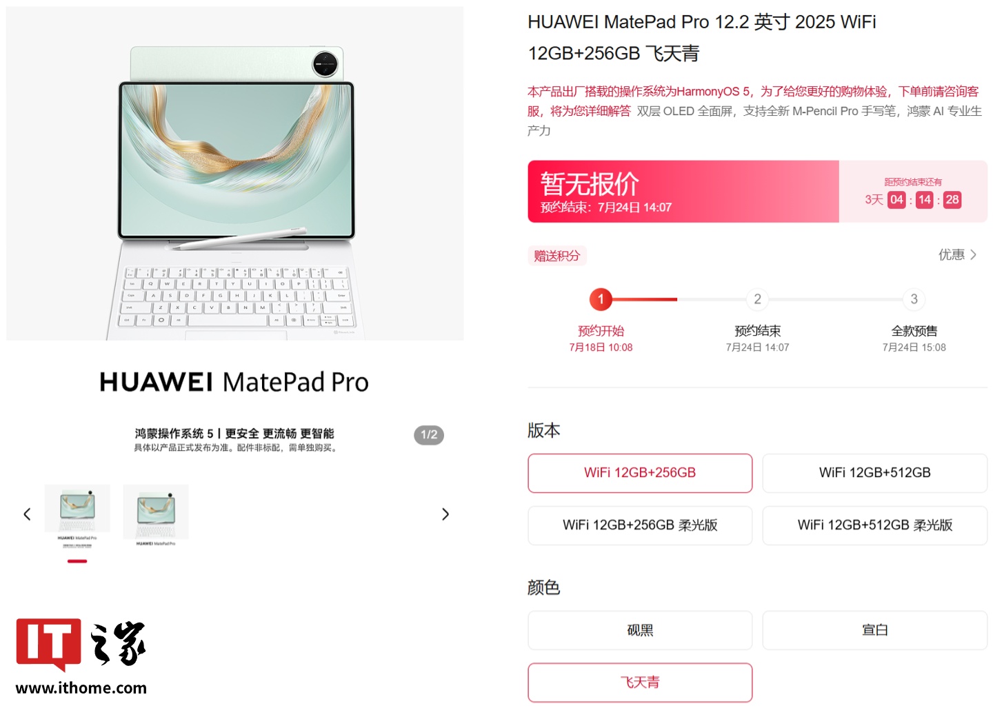 IT之家注意到,华为 MatePad Pro 12.2 英寸 2025 平板新品已上架华为商城并公布了部分信息,包括版本、颜色等(价格暂未公布):