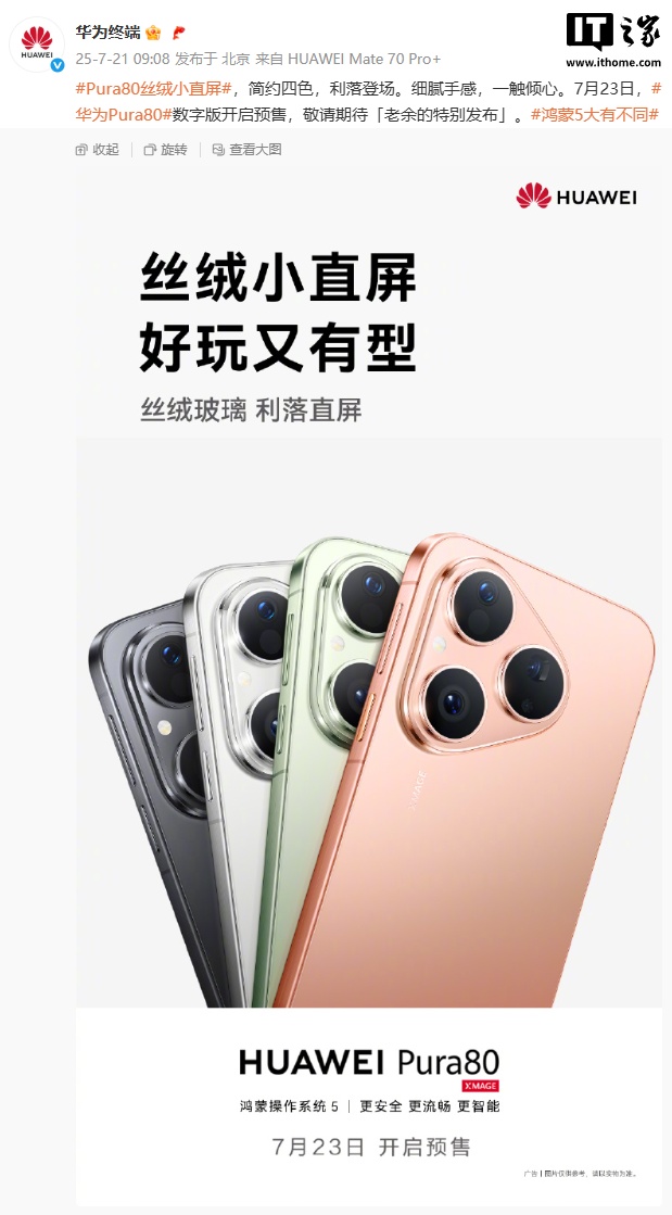 IT之家 7 月 21 日消息,华为今日官宣,Pura80 数字版手机 7 月 23 日开启预售,搭载鸿蒙操作系统 5,敬请期待「老余的特别发布」。