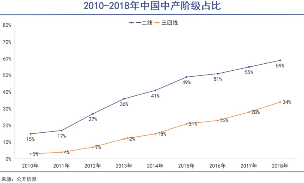 根据麦肯锡发布的《中国消费者调查报告》,我国一二线城市人口中达到中产阶级及以上收入水平的人口从2010年的15%上升到2018年的59%。正常情况下,这些居民有更强的消费信心,愿意为新型消费支出更多。