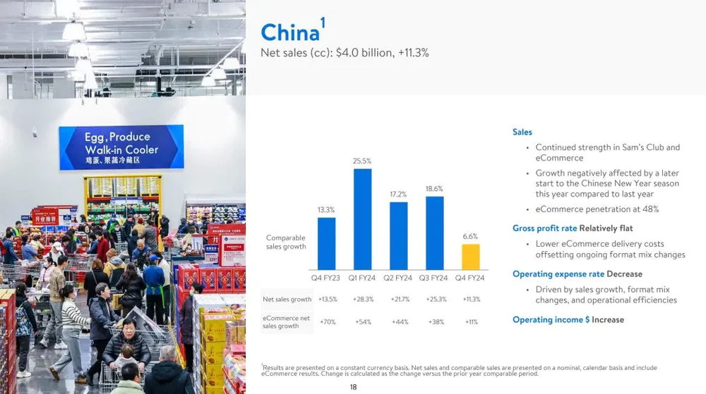 今年1月,曾有市场传闻称山姆中国2024年全渠道销售额达到1005亿元,其中线上销售占比超过48%。而山姆母公司沃尔玛的首席财务官表示,“中国市场的山姆会员费收入增长超过35%,会员数量不断增加。”