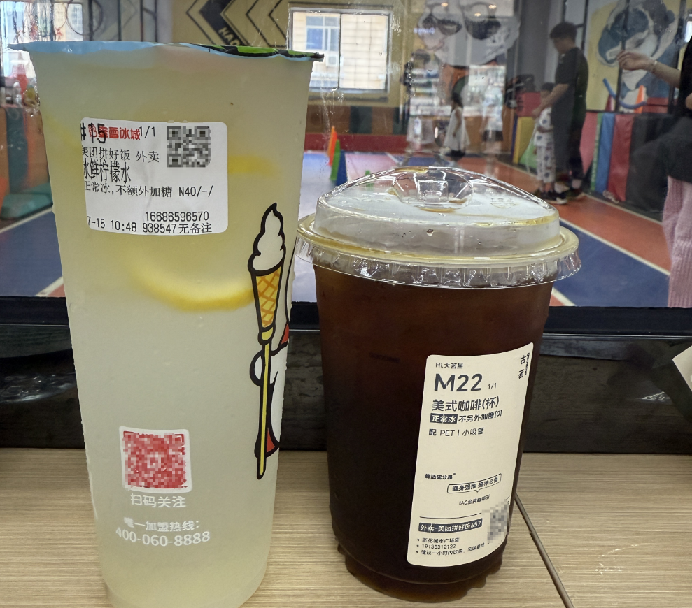 于是,回到县城的这一周,媳妇点外卖/自取的次数超过了平时一个月的量,三十七八度的高温天里,蜜雪冰城的柠檬水和冰咖啡确实是续命神器。买的次数多了,连我儿子见到路边的蜜雪冰城瓶子,都会条件反射唱: