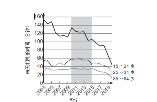 本图显示的是在2003—2019年不同年龄段的美国人,每天与朋友们共度的时间分别减少了多少。不足为奇的是,最年轻的群体(15~24岁)与朋友相处的时间比年长群体要多。21世纪最初几年,这种差异非常明显,但随后便开始缩小,2013年之后更是急速趋向一致。