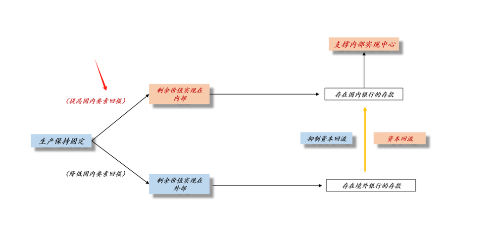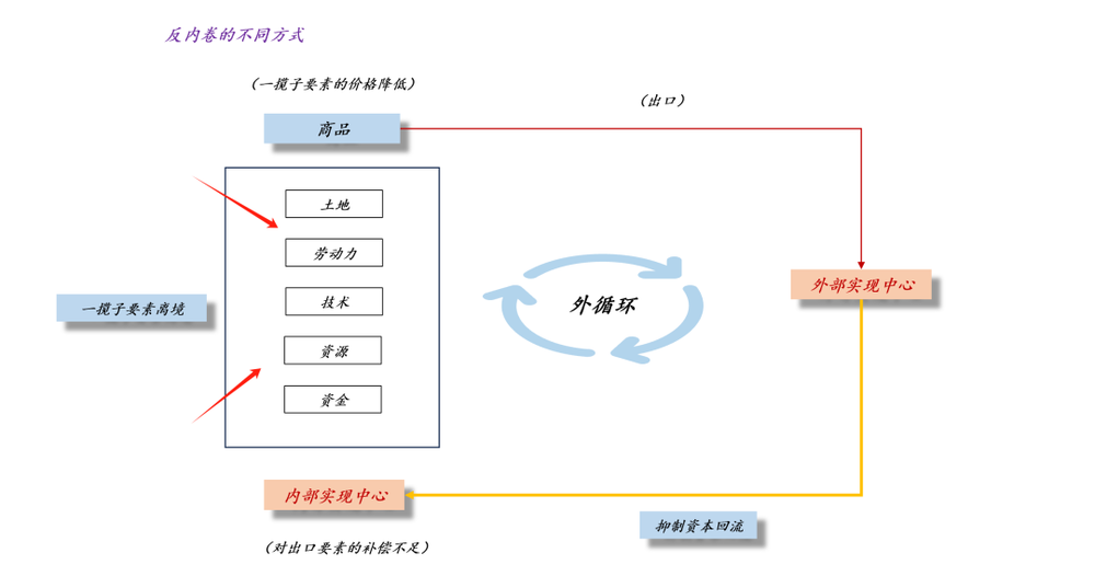 于是,我们就有了上面这张图,提高国内要素回报,会让剩余价值在内部实现,让企业的利润更多地留在国内。对称的,降低要素回报,会让剩余价值更多地在外部实现,让企业的利润更多地留在国外。如果在海外留的利润太多,那么,外循环就容易进入自我加强的模式,导致国内卷生卷死。
