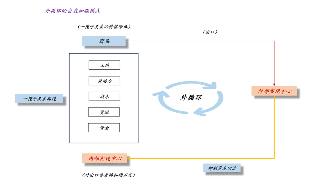 如果资本回流的比率较高(ps:最高为强制结售汇),外循环会相对比较平衡。一旦资本回流比率降低到某个阈值,那么,外循环就会进入自我加强模式:要素流到海外,却没有得到合理的补偿,于是,国内平均要素价格下跌;国内平均要素价格下跌,导致要素的进一步外流;如此反复。