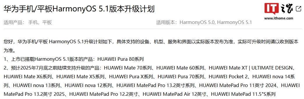 目前,华为官网已对手机 / 平板 HarmonyOS 5.1 版本升级计划有了更具体的推送时间说明,新版本确定将在月底前更新。
