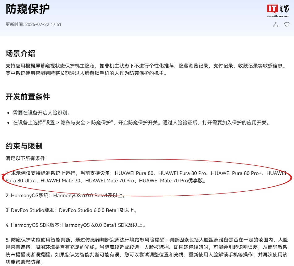 IT之家查询华为鸿蒙 HarmonyOS 开发者官网的开发文档获悉,“防窥保护”功能支持设备除 Pura80 外,还将支持 Mate 70、Mate 70 Pro、Mate 70 Pro 优享版机型,但系统版本当前限制条件为 HarmonyOS 6.0.0 Beta1 及以上(该文档更新时间为 2025 年 7 月 22 日)。