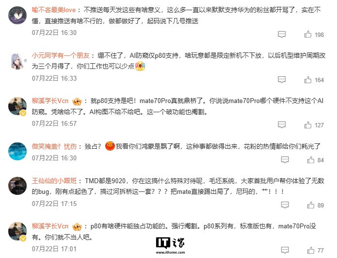 IT之家 7 月 23 日消息,华为官方昨日对鸿蒙 HarmonyOS 5.1 版本系统进行了宣传,其中介绍了“AI 防窥保护”这一功能,其支持应用根据屏幕窥视状态保护机主隐私。然而在官方的宣传物料中却小字注释仅 Pura80 系列机型支持,从而引发了用户的不满。