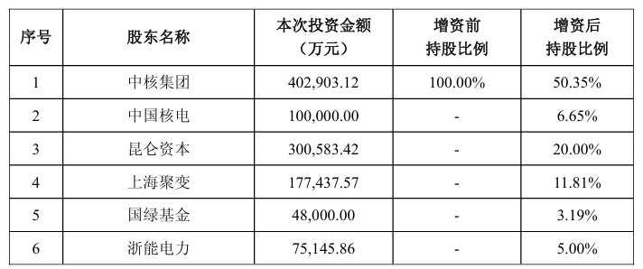 聚变公司目前为中国核工业集团有限公司(以下简称中核集团)全资子公司,本次交易将由中核集团、中国核电、中国石油集团昆仑资本有限公司(以下简称昆仑资本)、上海未来聚变能源科技有限公司(以下简称上海聚变)、国家绿色发展基金股份有限公司(以下简称国绿基金)、浙江浙能电力股份有限公司(以下简称浙能电力)及四川重科聚变能源科技有限公司(以下简称四川聚变)共同向聚变公司投资约 1,149,157.48 万元,其中公司投资金额为 100,000 万元。
