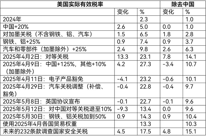 此次特朗普关税战看似来势汹汹,但分析师指出,实际威胁不及4月2日其首次宣布“对等关税”时。按照目前来看,未来美国平均有效关税税率大概率在15-16%的水平。