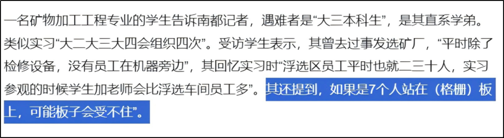 参观过的同学表示,现场比较可怕。很多人看新闻会觉得那机器不是长条状吗,摔下去不至于爬不出来吧。但有的槽很大,去过事发选矿厂的同学说,垂直高度十几米,人掉进去就动不了了。