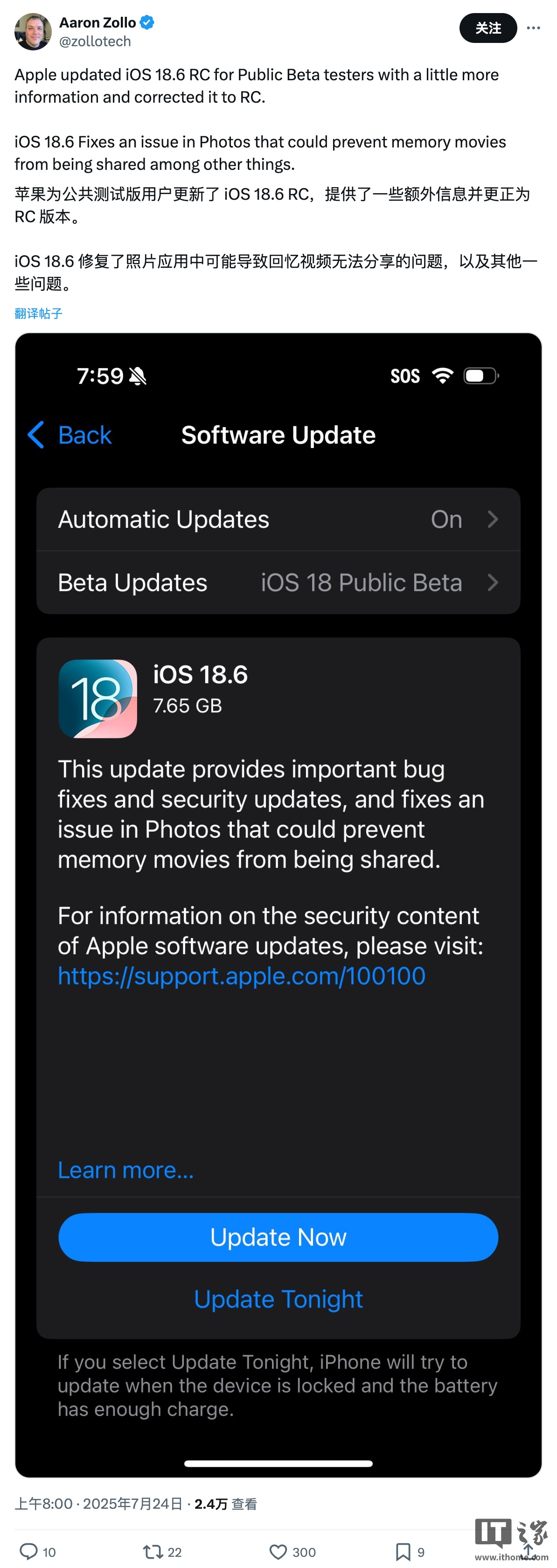 IT之家 7 月 24 日消息,根据 X 平台用户 Aaron Zollo 介绍,苹果发布了 iOS 18.6 更新说明,确认 iOS 18.6 主要集中在修复问题,提升 iPhone 的稳定性。