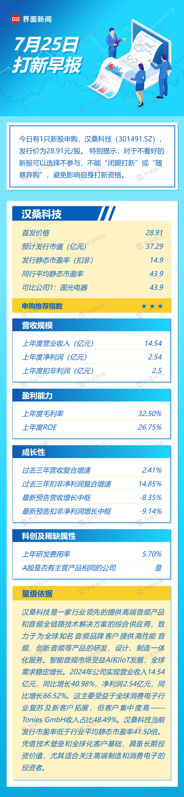 今日有1只新股申购,汉桑科技(301491.SZ),发行价为28.91元/股。