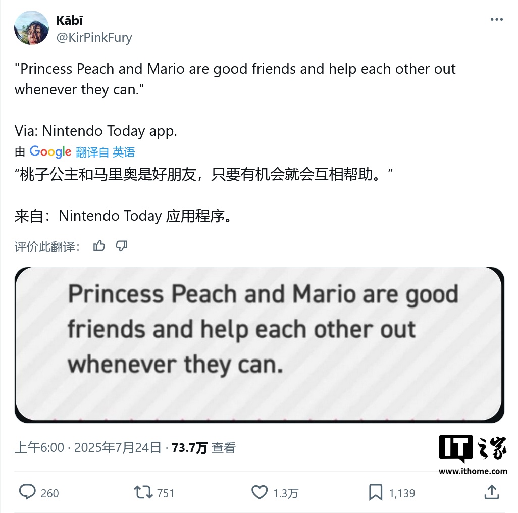 IT之家 7 月 26 日消息,游戏媒体 IGN 昨日(7 月 25 日)发布博文,报道称任天堂在其官方 Nintendo Today 应用中,称马力欧(Mario)和碧姬公主(Princess Peach)只是好朋友,并非多数玩家此前认为的情侣关系。