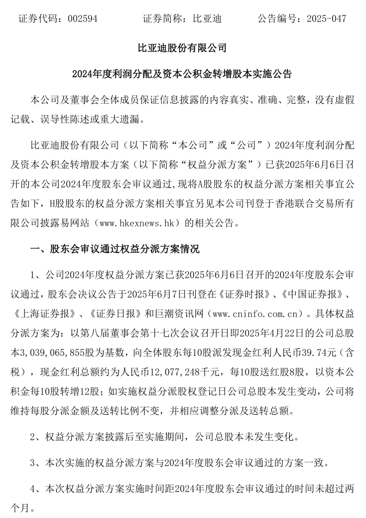 比亚迪 2024 年度权益分派方案为:公司以总股本 3,039,065,855 股为基数(其中 A 股 1,811,265,855 股,H 股 1,227,800,000 股),向全体股东每 10 股派发现金红利人民币 39.74 元(含税),现金红利总额约为人民币 12,077,248 千元,每 10 股送红股 8 股,以资本公积金每 10 股转增 12 股;如实施权益分派股权登记日公司总股本发生变动,公司将维持每股分派金额及送转比例不变,并相应调整分派及送转总额。