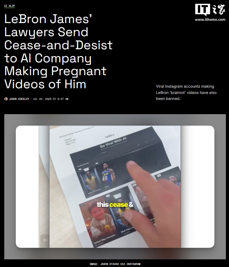 IT之家 7 月 26 日消息,篮球明星勒布朗・詹姆斯的法律团队一直在试图阻止病毒式 AI 视频的传播。