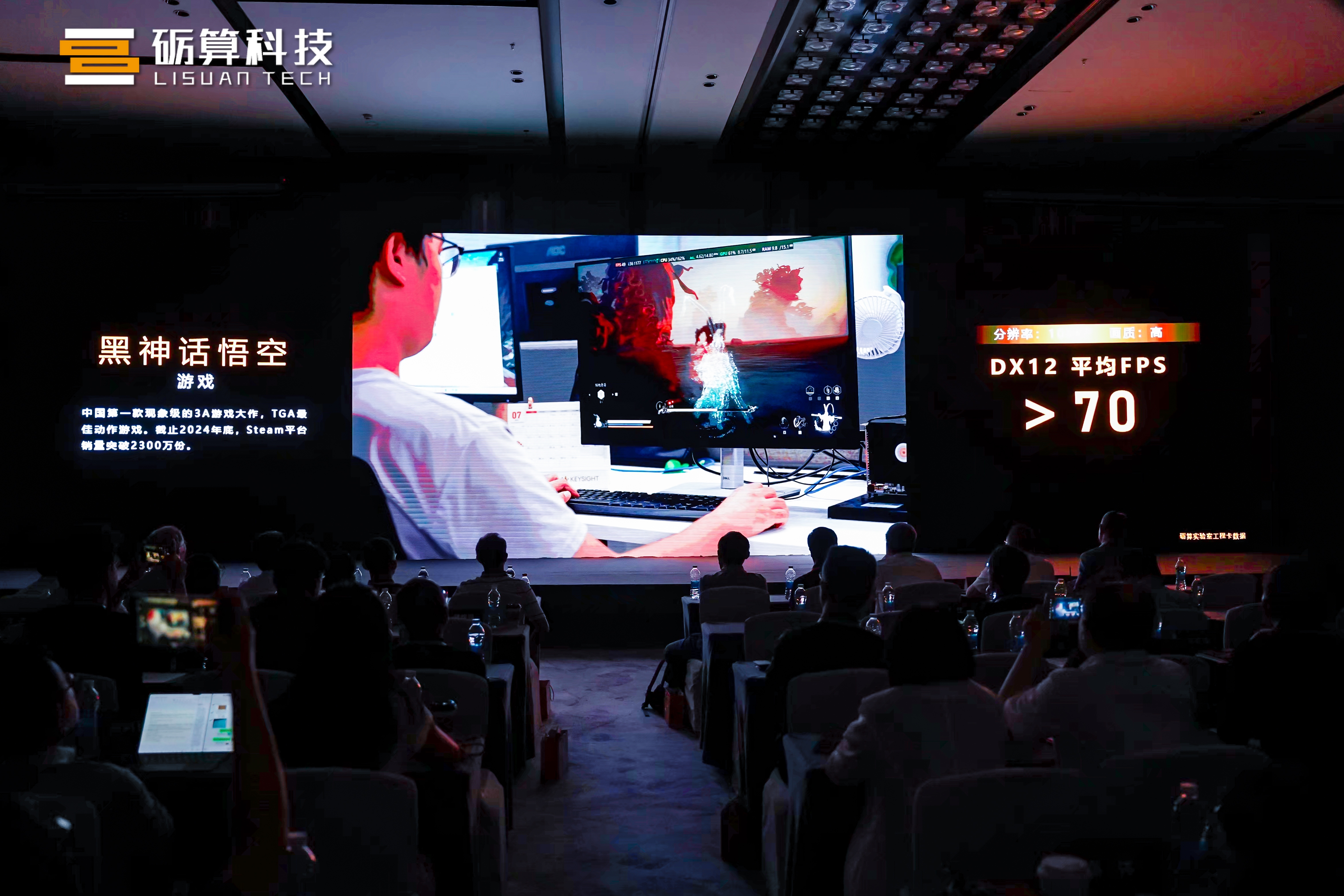 在今日的发布会上,砺算科技现场展示了 7G106 的游戏性能:《黑神话:悟空》在 4K Ultra HD 分辨率、高画质设置下能达到“可玩帧率”(DX12 平均 FPS>70)。
