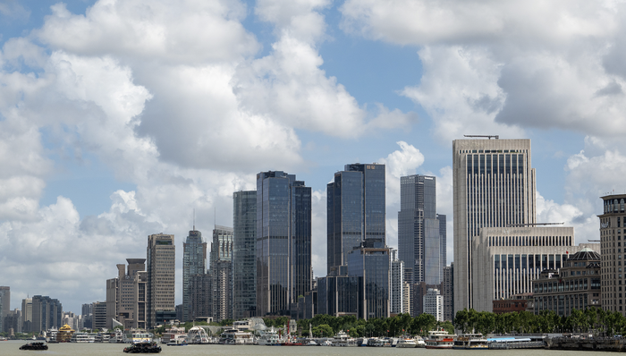 2025年7月23日,上海南京路外滩附近游客众多,陆家嘴摩天大楼上方蓝天白云,城市风景优美。图片来源:CFP