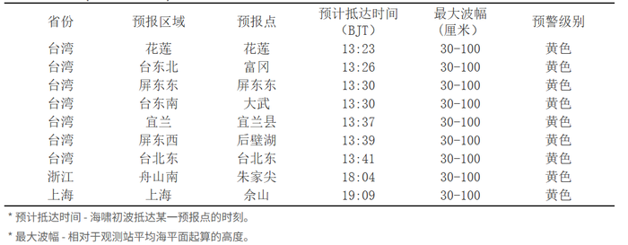 受地震或其他因素影响,预计海啸波将会在我国沿岸产生0.3(含)米至1.0米的海啸波幅,自然资源部据此发布海啸黄色警报。