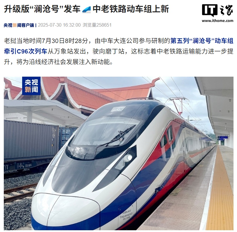 IT之家 7 月 30 日消息,据央视新闻报道,老挝当地时间 7 月 30 日 8 时 28 分,由中车大连公司参与研制的第五列“澜沧号”动车组牵引 C96 次列车从万象站发出,驶向磨丁站,这标志着中老铁路运输能力进一步提升,将为沿线经济社会发展注入新动能。