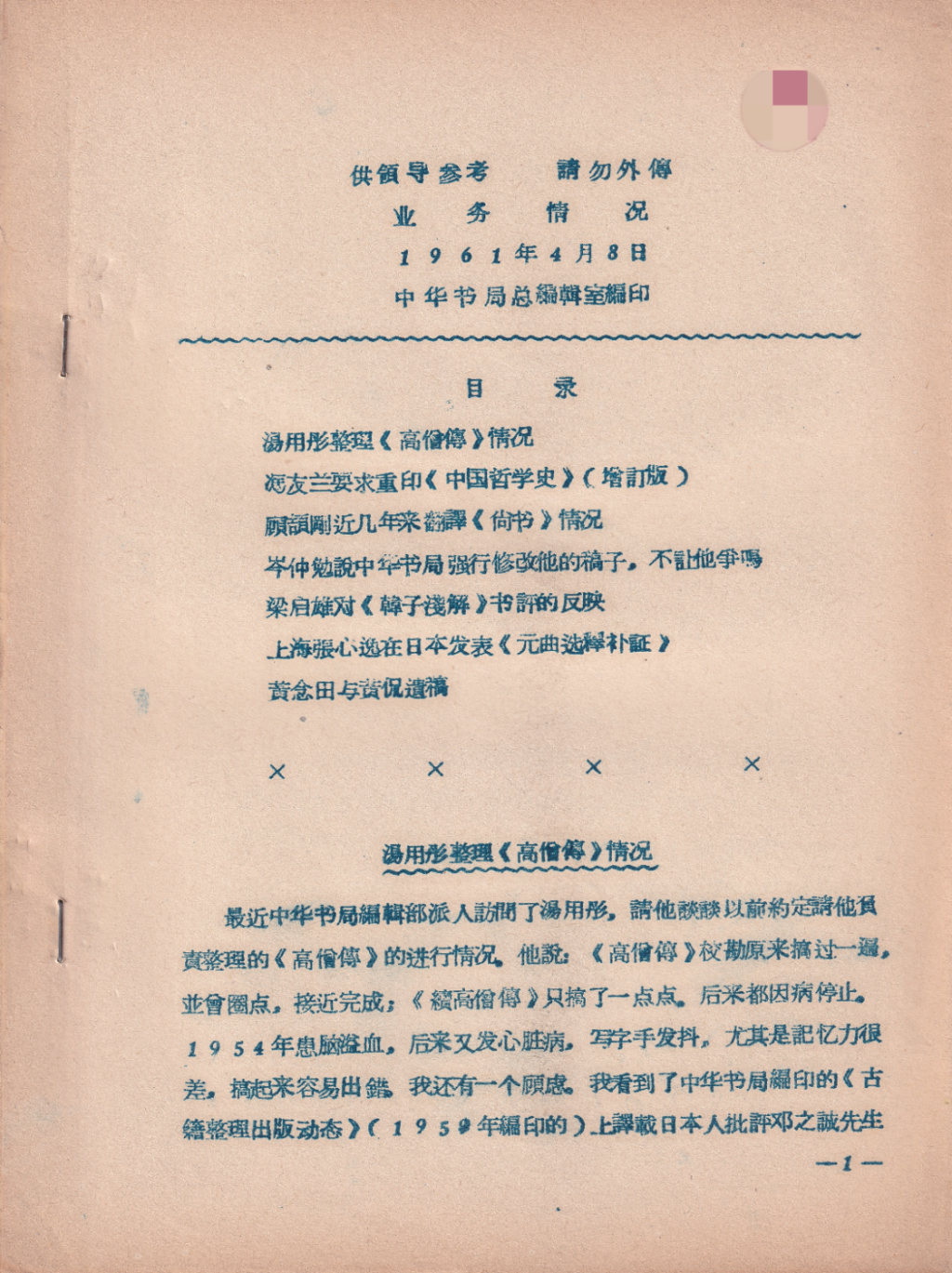 对研究上世纪五十年代末到六十年代初的学术出版史,中华书局内部编印的《业务情况》具有重要的参考价值。比如入矢义高(1910-1998)写书评批评邓之诚《东京梦华录注》这一事件(参看我写的《“其辞极溪刻,指摘甚当”——有关入矢义高两篇书评的一些史料》,《中国文化》第60期,2024年秋季号,378-398页),《业务情况》就能提供很好的补充材料。承宋希於相告,在他收藏的中华书局总编辑室于1961年4月8日编辑油印的《业务情况》中,收有一篇《汤用彤整理〈高僧传〉情况》(图十,图十一),文章显示入矢义高书评事件在当时传播甚广,就连已经答应中华书局整理《高僧传》但因患病而不得不中断工作的汤用彤(1893-1964)都知道了: