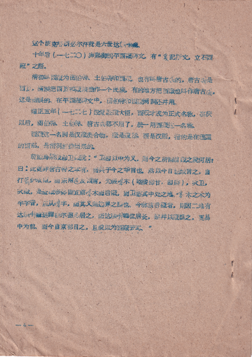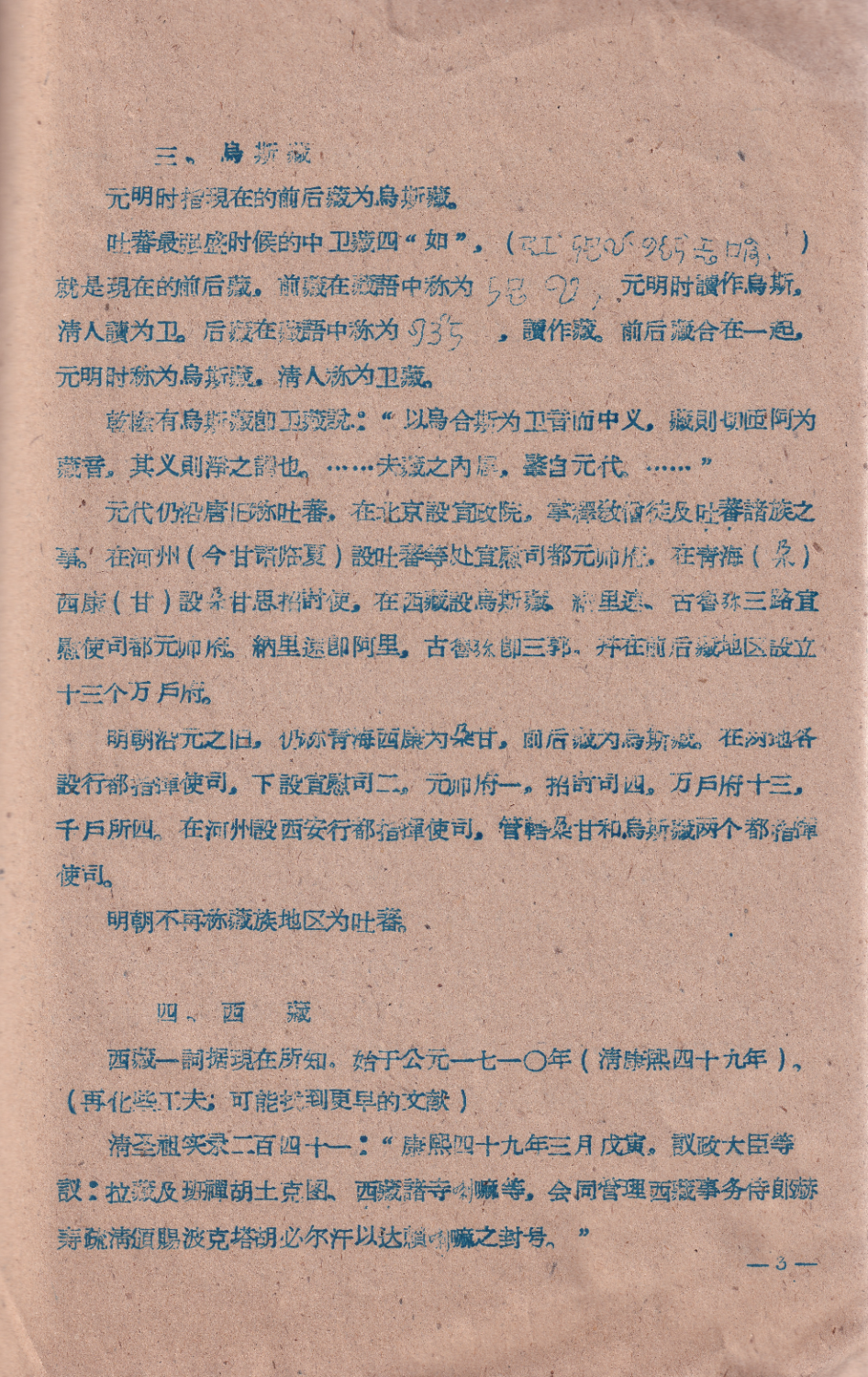 第三……这个地区当时[引者按指元朝]也分别称为朵甘思(今青海和西康),乌斯藏(前后藏)。到明朝,吐蕃这一名词不再通行了,通称这地区为朵甘思和乌斯藏。到清朝读乌斯为卫,称为卫藏。十八世纪以后,因为藏在西部,冠以方向,称为西藏,西藏这名词是汉藏文的综合。(录文据《春天集》)