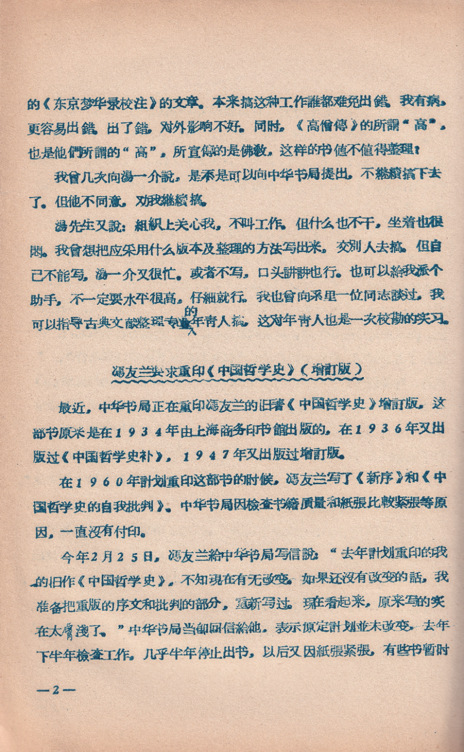 最近中华书局编辑部派人访问了汤用彤,请他谈谈以前约定请他负责整理的《高僧传》的进行情况。他说:《高僧传》校勘原来搞过一遍,并曾圈点,接近完成;《续高僧传》只搞了一点点。后来都因病停止。1954年患脑溢血,后来又发心脏病,写字手发抖,尤其是记忆力很差,搞起来容易出错。我还有一个顾虑。我看到了中华书局编印的《古籍整理出版动态》(1959年编印的)上译载日本人批评邓之诚先生的《东京梦华录校注》的文章。本来搞这种工作谁都难免出错。我有病,更容易出错。出了错,对外影响不好。同时,《高僧传》的所谓“高”,也是他们所谓的“高”,所宣传的是佛教,这样的书值不值得整理?