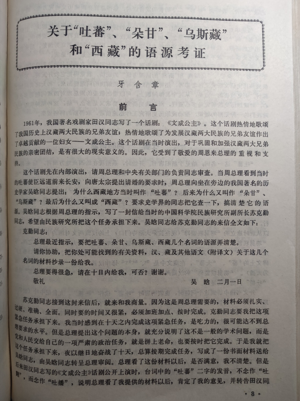 这个话剧先在内部演出,请周总理和中央有关部门的负责同志审查。当周总理看到当时的吐蕃使臣远道前来长安,向唐太宗提出请婚的要求时,周总理向坐在旁边的我国著名的历史学家吴晗同志提出:为什么西藏地方当时叫作“吐蕃”?后来为什么又叫作“多甘”、“乌斯藏”?最后为什么又叫成“西藏”?要求史学界的同志把它查一下,搞清楚它的语源。吴晗同志根据周总理的指示,写了一封信给当时的中国科学院民族研究所副所长苏克勤同志,希望由民族研究所把这个任务承担下来。吴晗同志给苏克勤同志的来信全文如下: