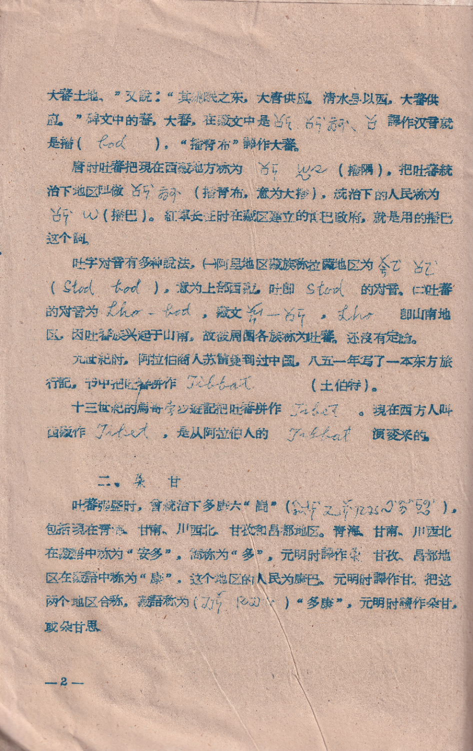 最近,我在清理过去的旧稿时,偶然发现了吴晗同志写给苏克勤同志的信和我写的“关于‘吐蕃’、‘朵甘’、‘乌斯藏’和‘西藏’的语源考证”的底稿,我觉得把它公开发表,不仅可供藏族历史语文研究工作者参考,还可把当时没有彻底解决的问题提出来,和大家共同加以探讨。而更重要的一点是,从这个具体问题上,可以看出敬爱的周总理对西藏问题是多么关心,对藏族历史的研究是多么重视,而对藏史研究的要求又是多么严格,这种精神实际上是对我们的一种无形的鞭策,推动藏族历史研究工作迅速前进,取得新的科研成果。