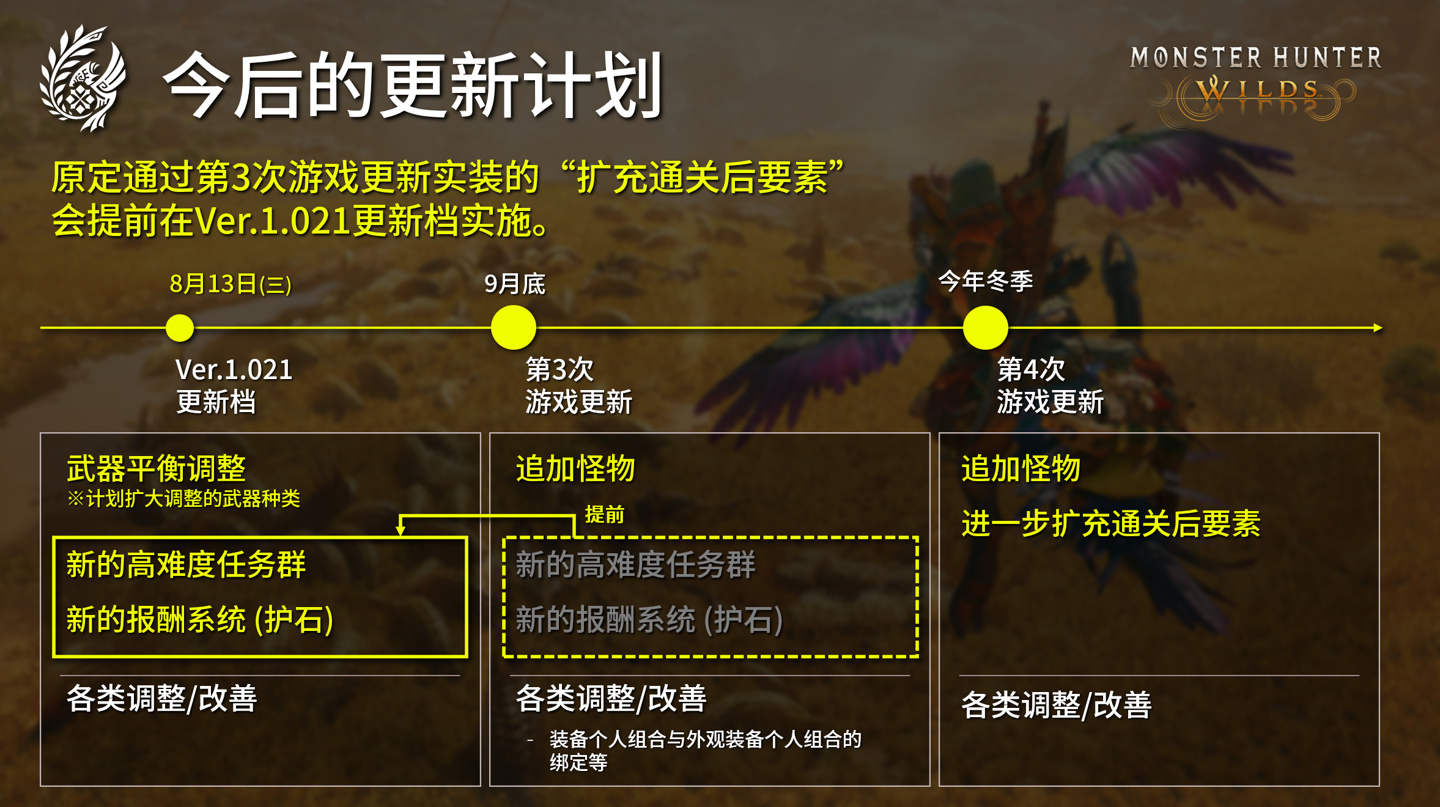 IT之家 7 月 30 日消息,卡普空今日发布了有关 Ver.1.021 更新的通知,宣布原定在 9 月底发布的《怪物猎人:荒野》第 3 次大型免费游戏更新内容会提前在 8 月 13 日发布的 1.021 版本实施安装,具体内容后续公布。