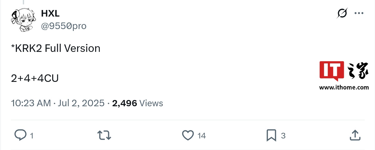 而根据 X 平台消息人士 HXL (@9550pro) 在本月初的表态,锐龙 AI 5 330 实际上是 "KRK2" (Krackan Point 2) 的阉割版本,这一芯片的完整规格为 2+4 核心 CPU 搭配 4CU GPU。