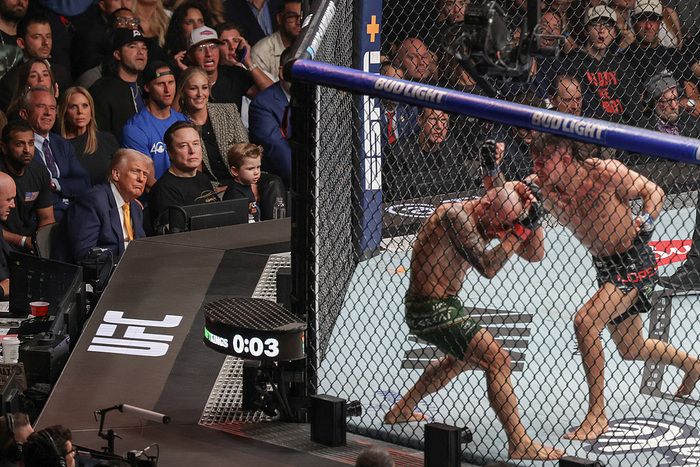 2025年4月12日,美国佛罗里达州迈阿密,特朗普与马斯克及其儿子共同观看UFC比赛。来源:视觉中国