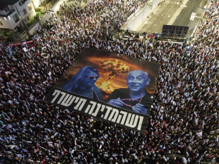 影片的叙事在此被内部抗议的场景打断,揭示了内塔尼亚胡日益衰弱的权威。分析人士认为,他与极右翼达成和解协议,而极右翼支持战争机器的继续运转。随着战斗持续,血腥屠杀不断,审判被遗忘。因此,总理试图尽可能延长战争,以巩固和巩固他的政治地位。