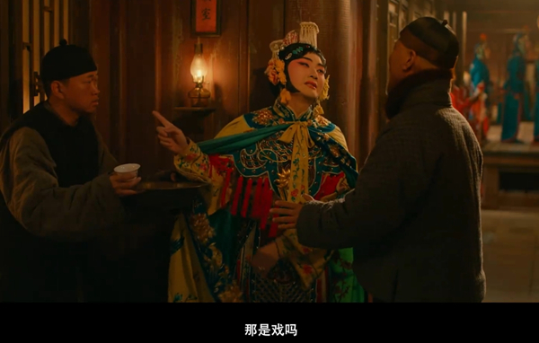 大嗓儿和洪大帅在戏院后台的相遇,当乐亭人遇见滦县人,老乡见老乡。因为不知道洪大帅的身份,大嗓儿一边敢直呼大帅“棒槌”,一边对其倾囊相授,有模有样地把京剧的行头和规矩科普了一遍,喜神娃娃、大衣箱二衣箱三衣箱……