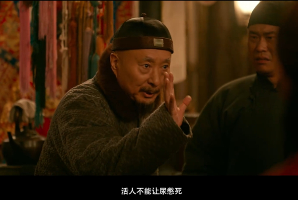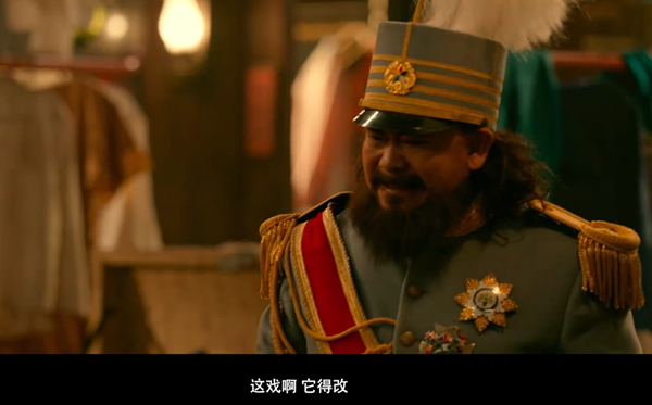 因为不认识名角金啸天(尹正 饰),大帅对大嗓儿一脸崇拜。一个敢讲,一个敢信,半吊子票友把完全不懂戏的大帅唬得一愣一愣。
