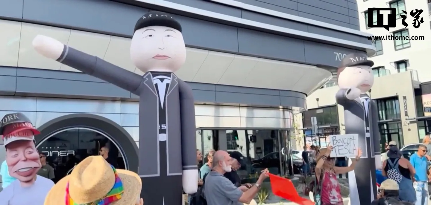 当然,如今特斯拉的任何举动都容易引发争议。洛杉矶地区的特斯拉门店(以及全球各地)已经遭受了数月的“拆除特斯拉”抗议活动,而该餐厅开业第一天,就出现了一名单独的抗议者,到了第一个周末,抗议规模显著扩大,抗议者竖起了两个模仿马斯克并反复做出纳粹敬礼动作的“挥舞手臂的充气人偶”。此外,今天下午还会有另一场抗议活动,而且“拆除特斯拉”组织计划每周六和周日从下午 4 点到 7 点持续进行抗议。