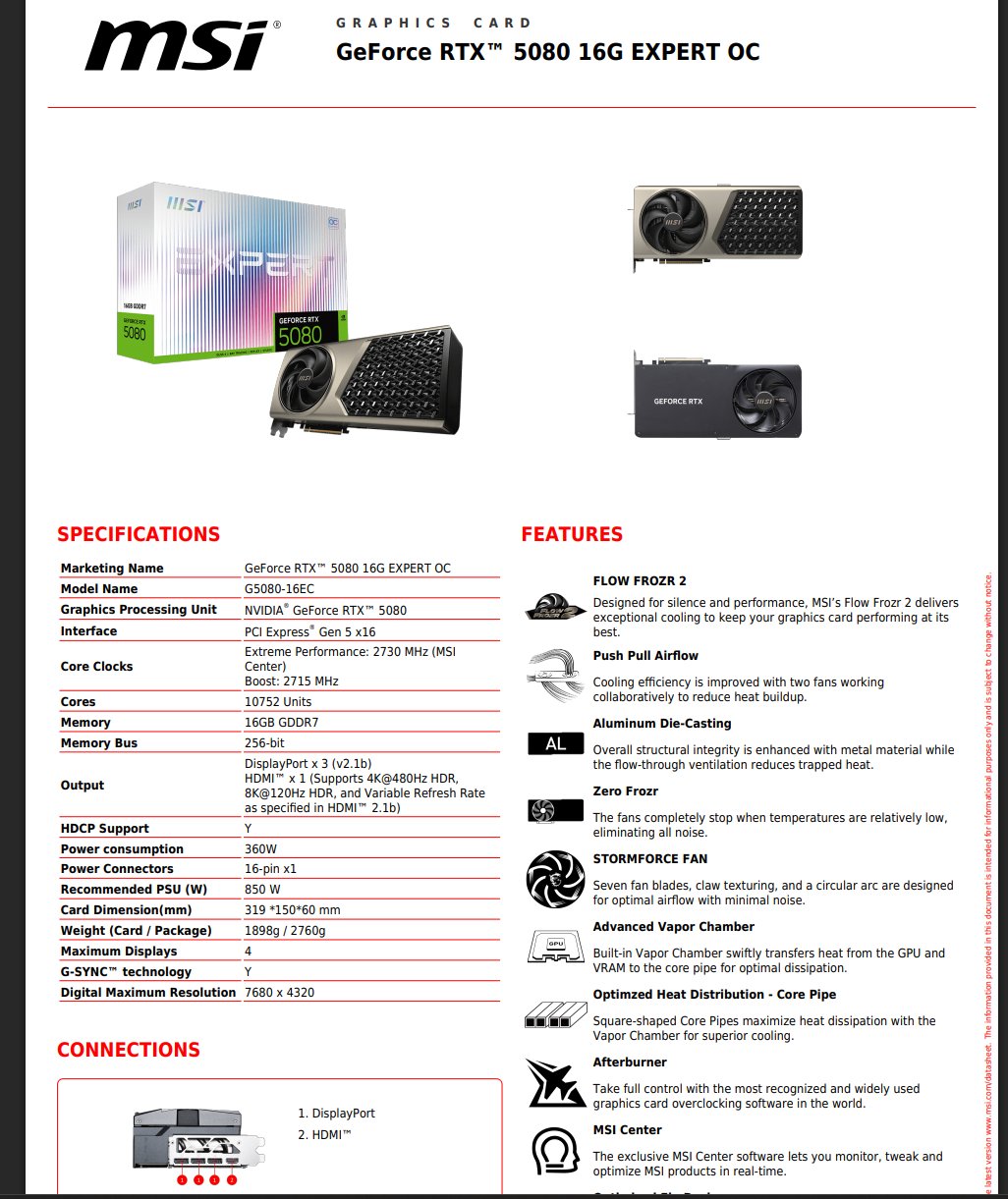 规格方面,RTX 5080 Expert 重约 1.9 公斤,尺寸约 319 ×150 ×60mm;OC 加速频率可达 2715 MHz,功耗为 360W,需搭配 850W 及以上电源使用;提供三个 DP 2.1b 和一个 HDMI 2.1b 接口。