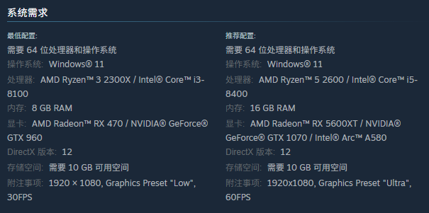 显卡:AMD Radeon™ RX 5600XT / NVIDIA® GeForce® GTX 1070 / Intel® Arc™ A580