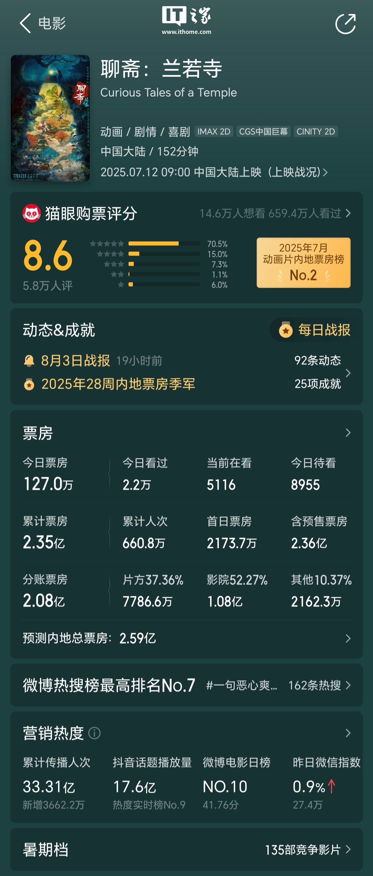 截至IT之家发稿,追光动画电影《聊斋:兰若寺》累计票房 2.35 亿、累计人次 660.8 万,预测内地总票房 2.59 亿。本片目前豆瓣评分 6.6,超 3.6 万人评分,5 星占比 12.8%、4 星占比 28.5%、3 星占比 41.0%、2 星占比 13.5%、1 星占比 4.2%。