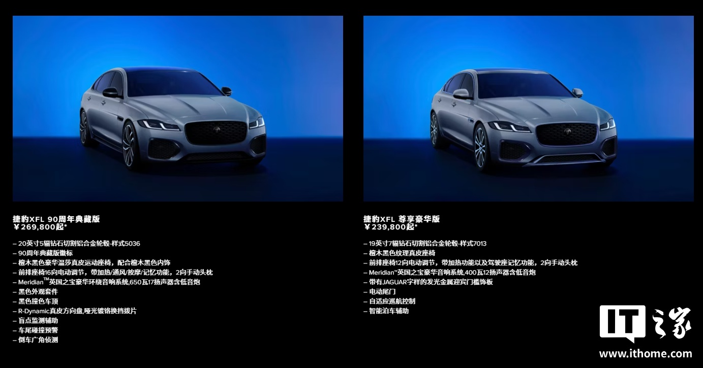 IT之家 8 月 5 日消息,捷豹官方宣布 XFL 尊享豪华版和 90 周年典藏版正式上市,两款新车的折扣后厂商建议零售价分别为 23.98 万元起和 26.98 万元起。