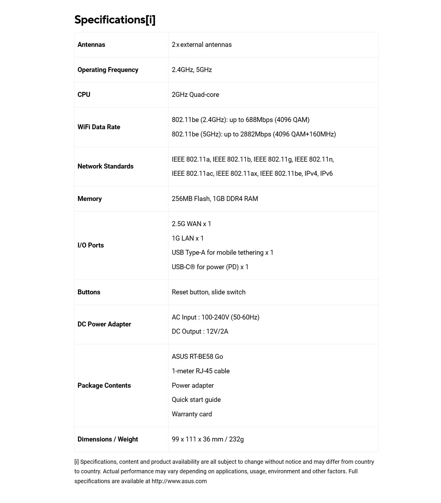 RT-BE58 Go 配备 2.0 GHz 四核 CPU、1GB DDR4 内存、256MB 闪存,提供了一个 2.5Gbps WAN 口、一个 1Gbps LAN 口,以及 USB-A(移动网络共享)接口和 USB-C(18W PD 供电)。