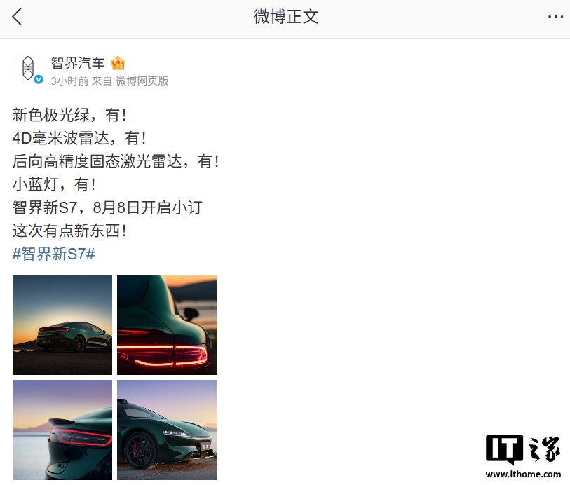 IT之家 8 月 5 日消息,智界汽车官方微博今日分享了智界新 S7 轿车实车图,并确认部分核心亮点升级配置,包括:新色极光绿、4D 毫米波雷达、后向高精度固态激光雷达、小蓝灯(智界产品总监 @智界海蓝天 已表示雷达等配置全系标配)。新车将于 8 月 8 日开启小订,官方表示“这次有点新东西”。
