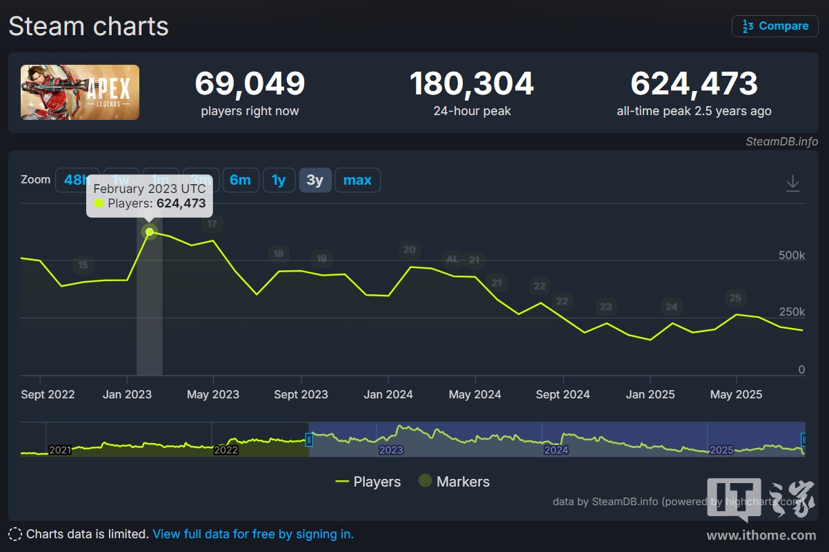 《Apex 英雄》在发售前三天就迎来了 1000 万玩家,并在发布月结束时突破了 5000 万大关。根据 SteamDB 的数据,该游戏在 2023 年达到了 624473 名同时在线玩家的峰值。截止IT之家发文,该游戏的 Steam 在线人数为 69049。