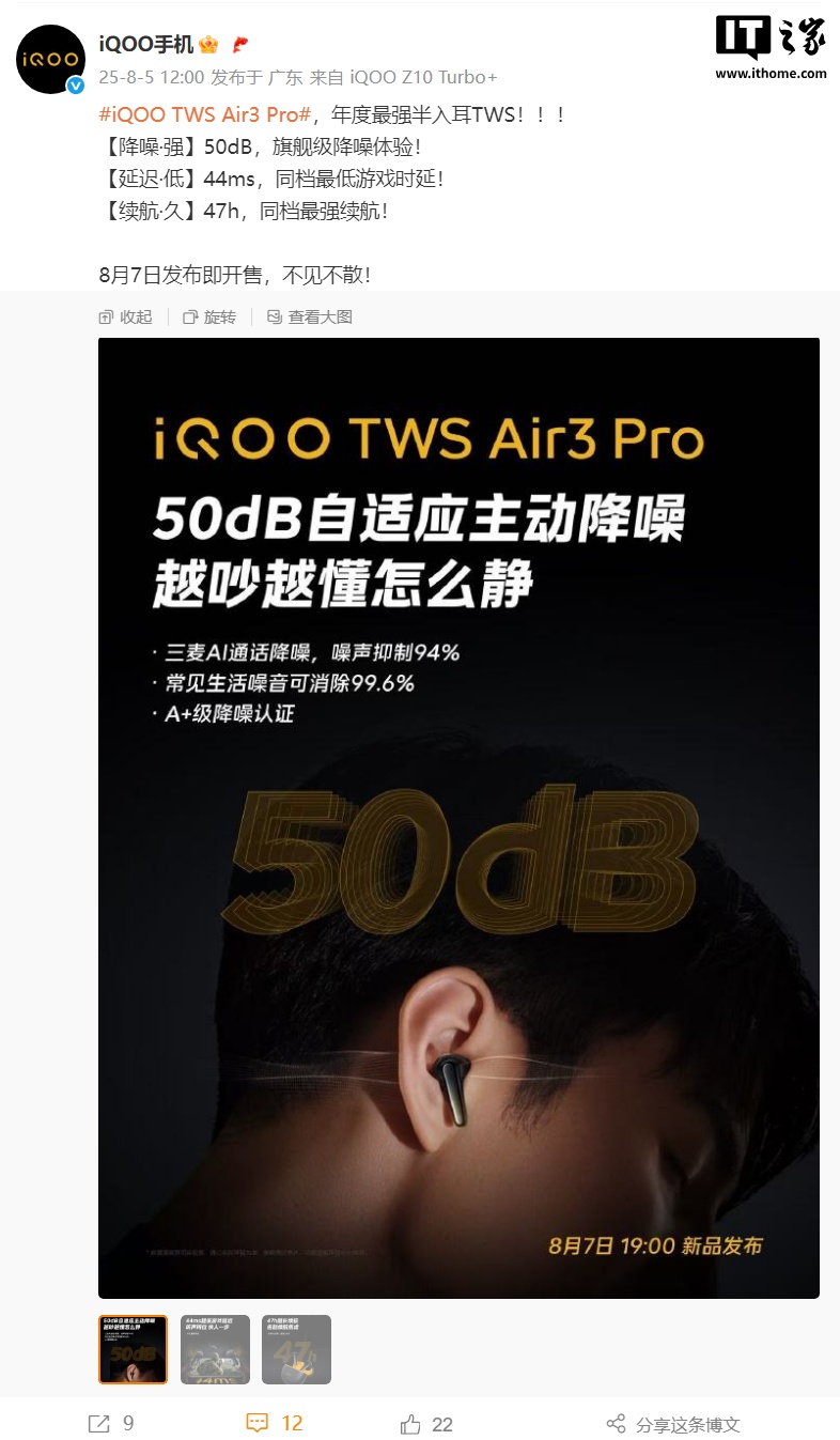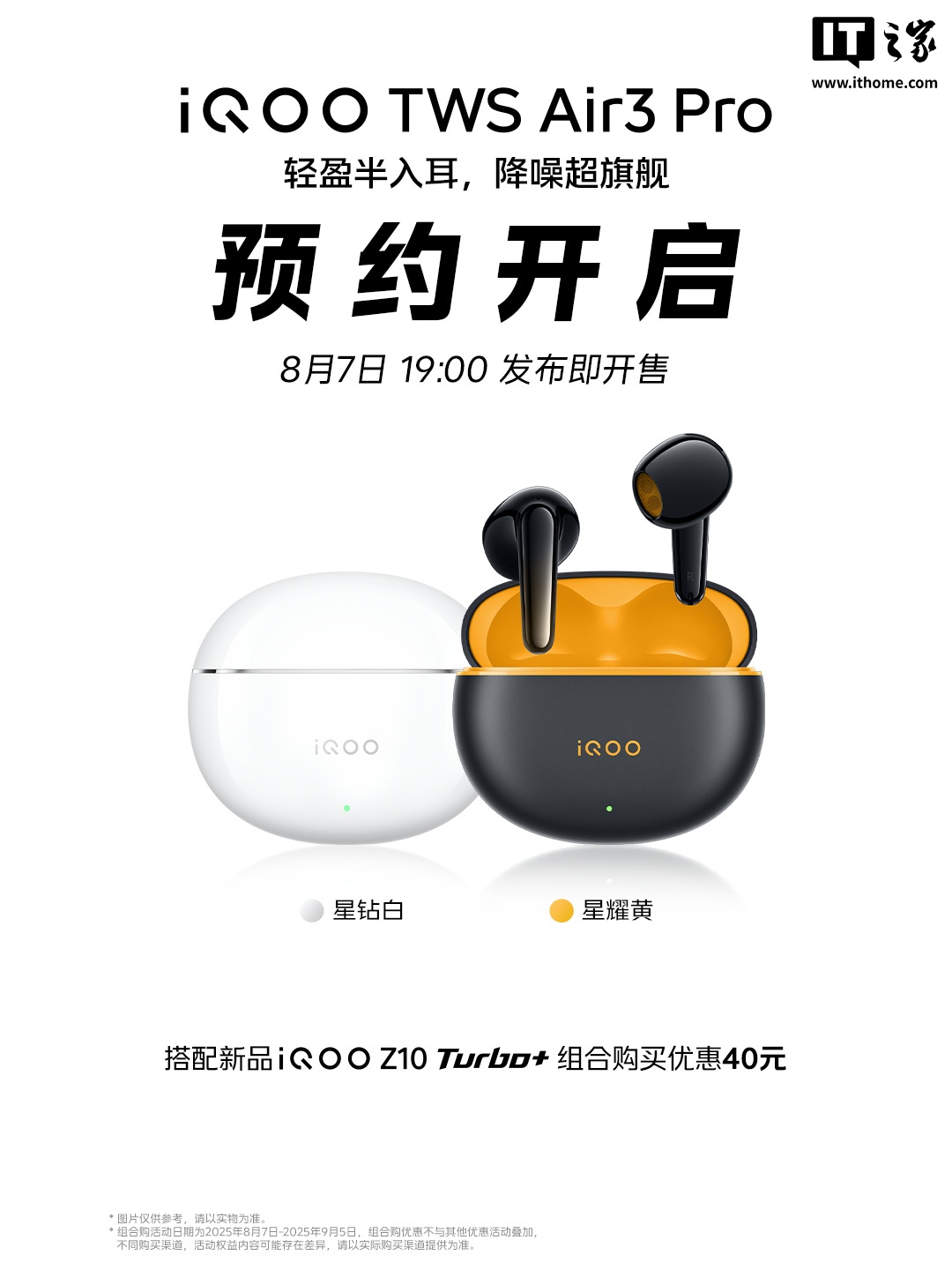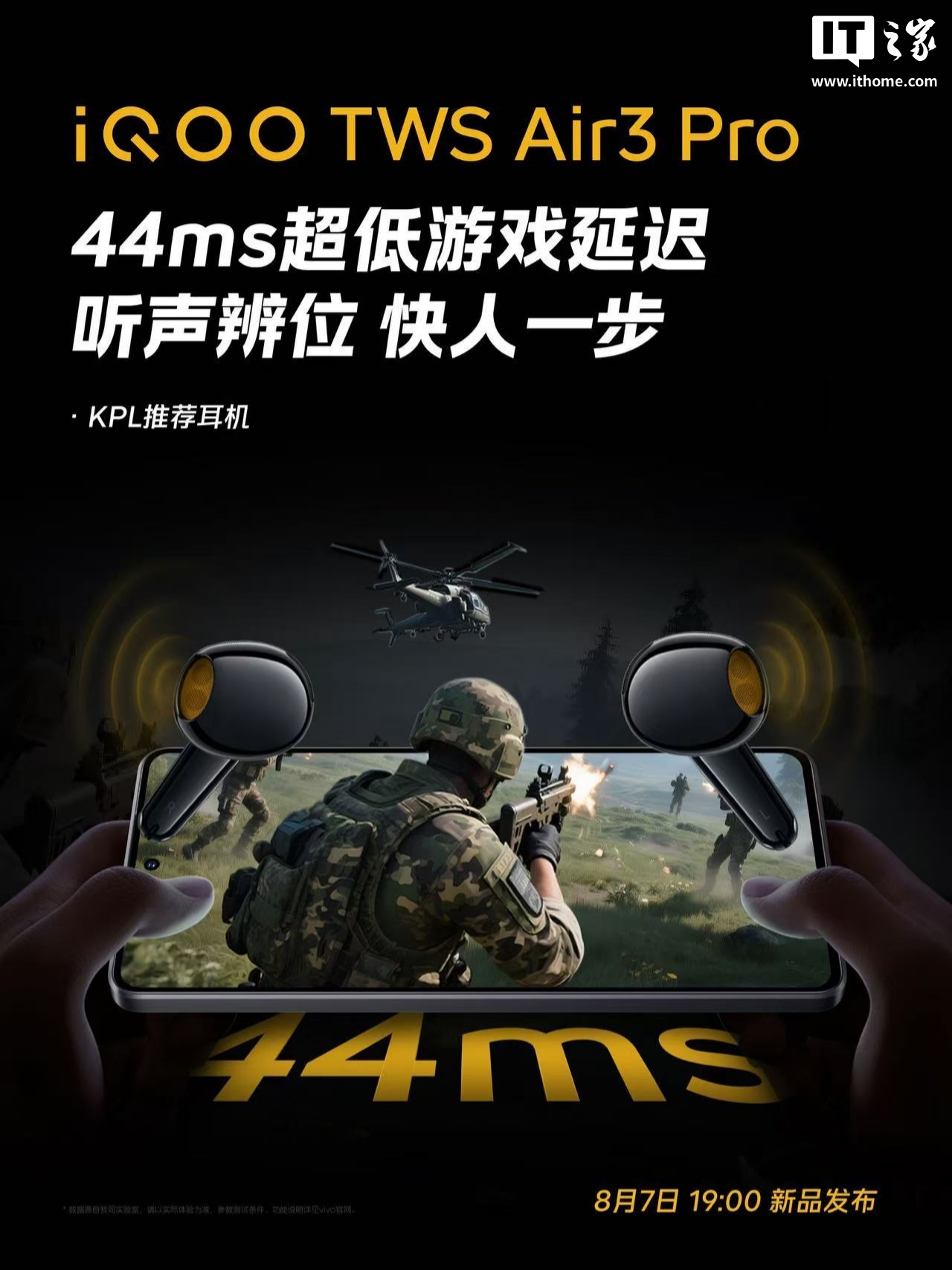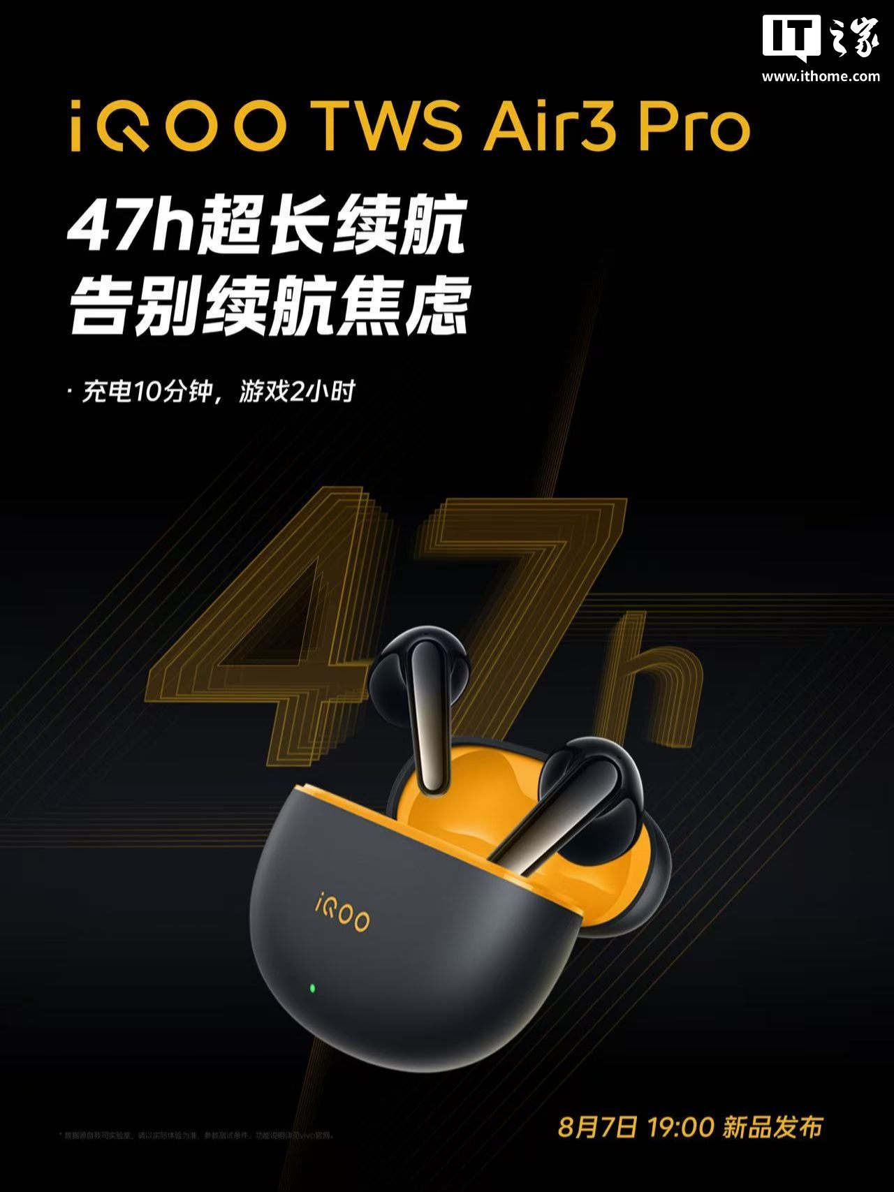 IT之家 8 月 5 日消息,iQOO 今日官宣,iQOO TWS Air3 Pro 耳机将于 8 月 7 日发布即开售,号称是“年度最强半入耳 TWS”。