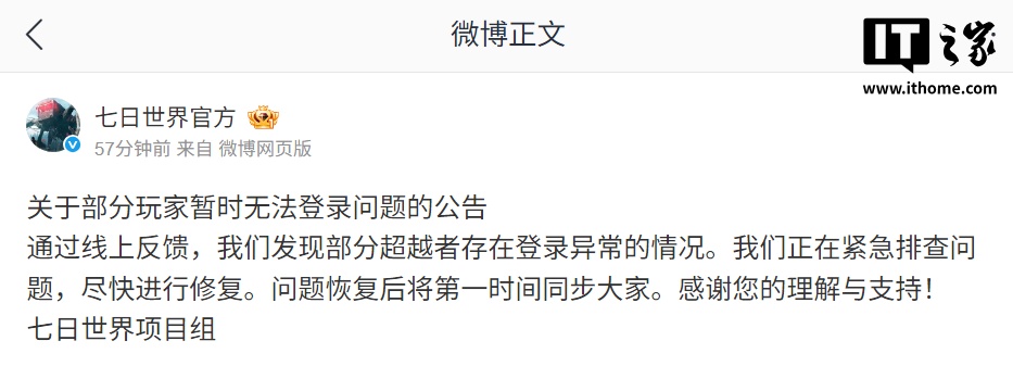 《七日世界》项目组表示:通过线上反馈,我们发现部分超越者存在登录异常的情况。我们正在紧急排查问题,尽快进行修复。问题恢复后将第一时间同步大家。感谢您的理解与支持!